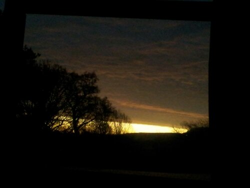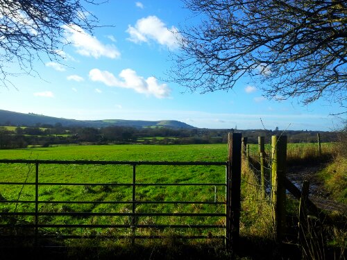 Some trees then night time fields stretching away to the gently sloping hills: the South Downs: a dark wave of chalk, earth and flint from horizon to horizon, under a clear bright star and moonlight lit sky.
